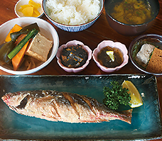 | 奄美の代表的な地魚、赤うるめ(グルクン)唐揚げがメインの「一村定食」。 |